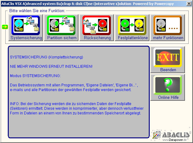 Klick wird die Datensicherung/Rücksicherung einer kompletten Systemfestplatte